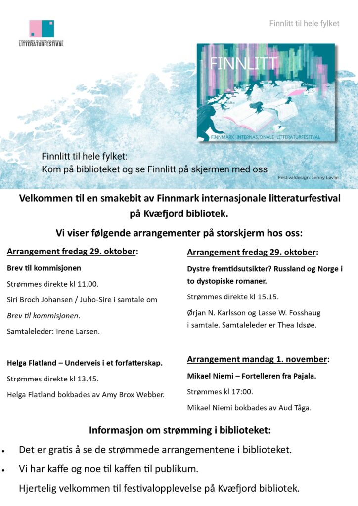Velkommen til en smak av festival hos Kvæfjord bibliotek fredag 29. oktober. Vi viser noen arrangement fra Finnmark internasjonale litteraturfestival på storskjerm i biblioteket.